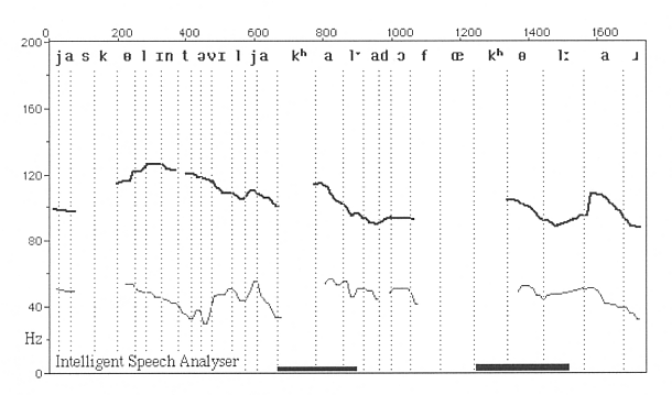 Ylläolevassa kuvassa on lausuttu lause 'Jag skulle inte vilja kalla dom för kullar.' Ylempi paksu käyrä kuvaa lauseen intonaatiota, F0:aa. Kuvassa on tiivistetysti tärkeimmät seikat ruotsin prosodiassa. Kaikki muu on lauseessa lyhyttä paitsi sivupainollinen 'kal-' ja pääpainollinen 'kul-'. Vain pääpainollisessa sanassa 'kullar' on aksentti. Koska sana on kaksitavuinen ja paino on ensimmäisellä tavulla on sanalla aksentti 2: ääni menee alas tavulla 'kul-' ja nousee ylös tavulla '-lar'. Sivupainollisessa sanassa ei ole aksenttia. Lauseen painottomissa osissa reduktio on runsasta ja intonaation muutokset vähäisiä. Pituuserot painottoman ja painollisen välillä ovat suuret. Kuuntele lausetta klikkaamalla kuvaa. |