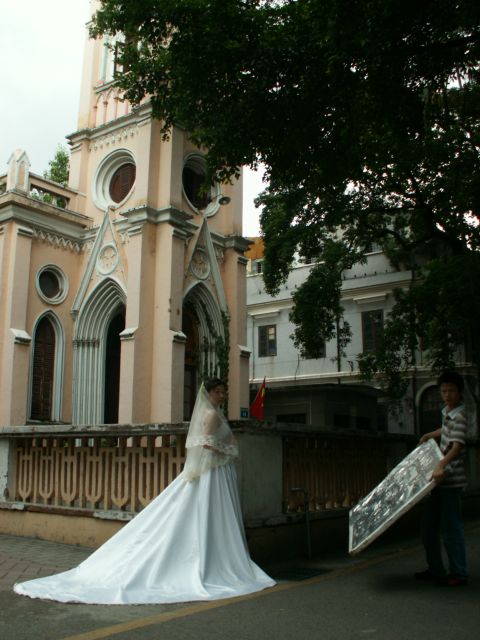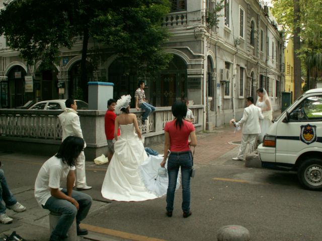 Puistossa oli parhaimmillaan 7 avioparia kuvattavana. Kiinalaiseen tapaan kuuluu tehdä ennen naimisiin menoa parista valokuvakansio erilaisissa asuissa ja paikoissa. Kuvat: P. Kaartinen.