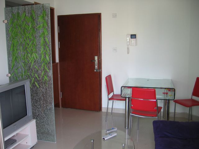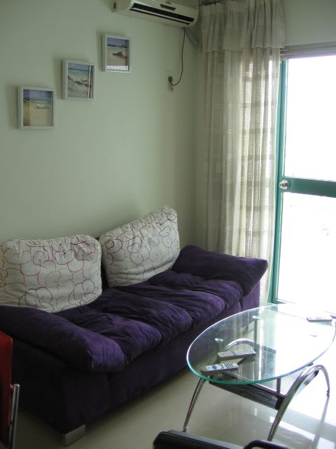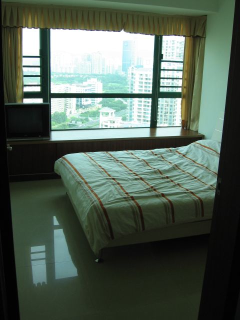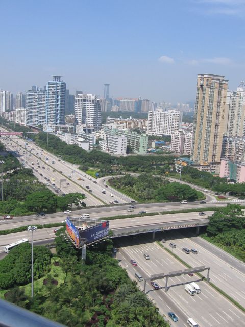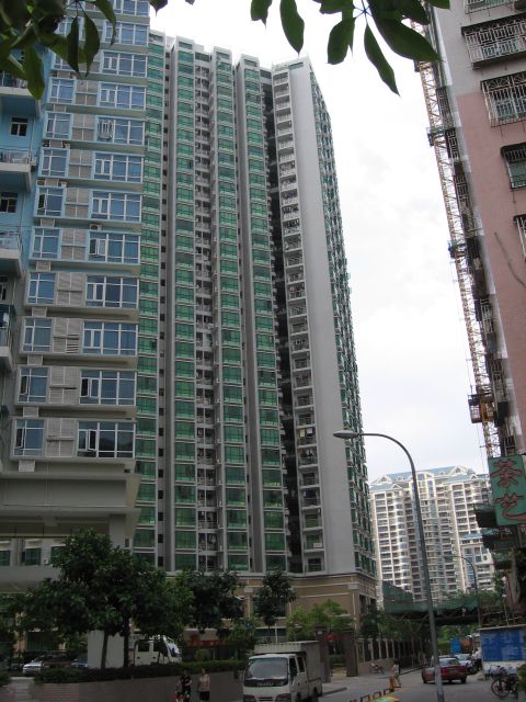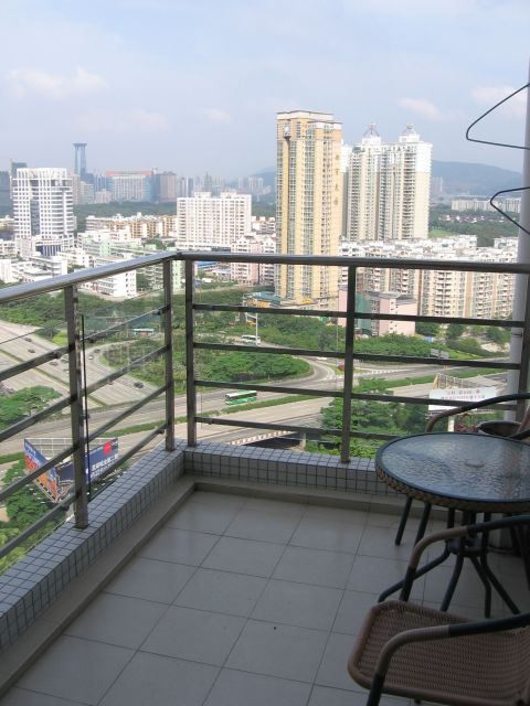 Kuva talosta, josta meille oli vuokrattuna pieni kaksio sekä näkymä parvekkeelta Shenzhenissä. Kämppä oli 24. kerroksessa.
