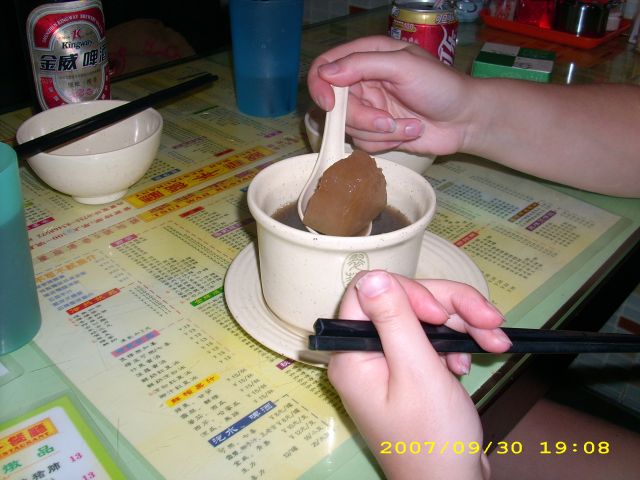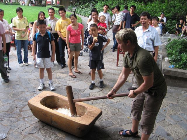 Kiertelyn jälkeen iski nälkä. Päästiin kokeilemaan, miten tehdään jotain liisterimäistä makeaa ruokaa riisistä hakkaamalla. Ruokapöydän kalusteet oli lastenkokoa, mutta nuudelit hyviä. Oikeanpuoleinen kuva P. Kaartinen.