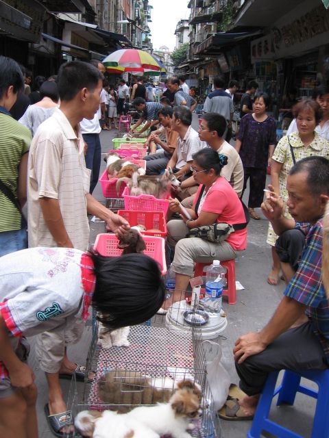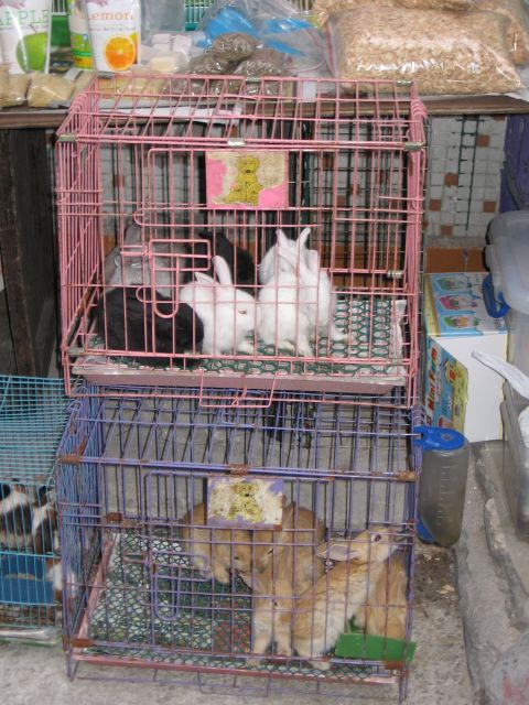 Vasemmalla mies pilkkoo kanaa. Ei tehnyt mieli jäädä syömään tuohon kaupunkiin.. Seuraava olisi pitänyt kiertää kaukaa. Lemmikkieläinmarket. Muutama katu täynnä myytäviä koiranpentuja, kissoja, kaneja, jyrsijöitä, lintuja ja kaloja. Onneksi oli pilvinen päivä, näky olisi paahteessa ollut pahempi. Pienimmät jyrsijät kuolevat kuumuuteen. Onneksi mukana oli kiinaa puhuva kaveri, edes pari kania sai vettä meidän pyynnöstä.