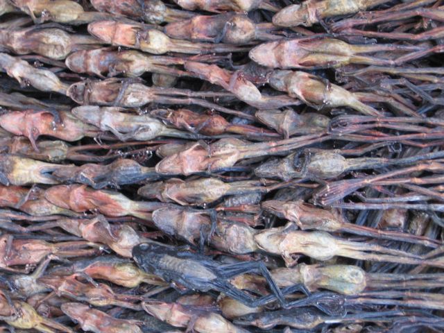 Vasemmalla etualalla mm. torakoita ja käärmeitä kuivattuina. Oikealla isoja kärpäsiä kuivattuna. Kuvat: P. Kaartinen.