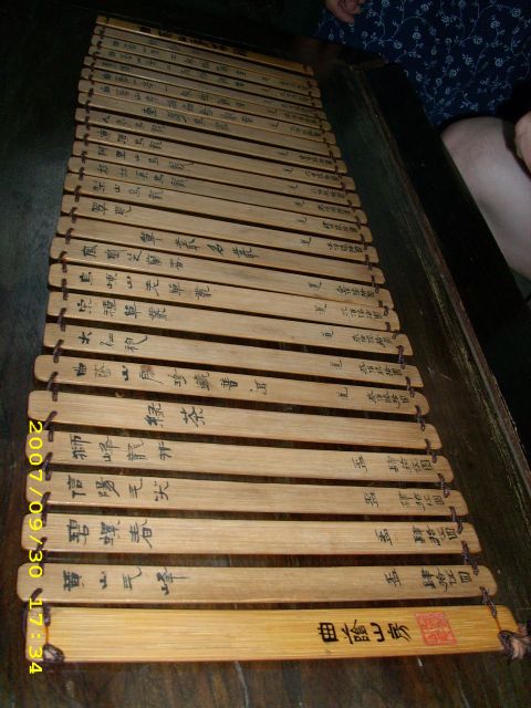 Teehuoneen teelista (josta on otettu kuva vähän väärin.. Yhdessä puulastussa on aina yhden teen nimi ja hinta, kuva olisi siis pitänyt ottaa vaakasuoraan) sekä ruokapaikan ensimmäisen ruokalaji, alla olevasta ruokalistasta voi valita syötävän.. jos osaa...