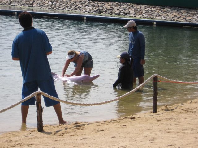 Delfiininäytöksessä pinkit delfiinit temppuili ja ihmiset hikoili rannalla.