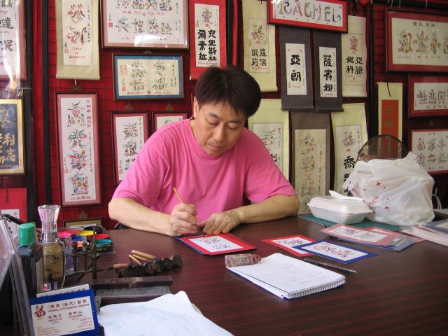 Chinatownin metroasemalta putkahdettiin ihan toisenlaiseen maailmaan. Mies kirjoitteli nimiä kiinakse sekä teki taidetta nimistä.