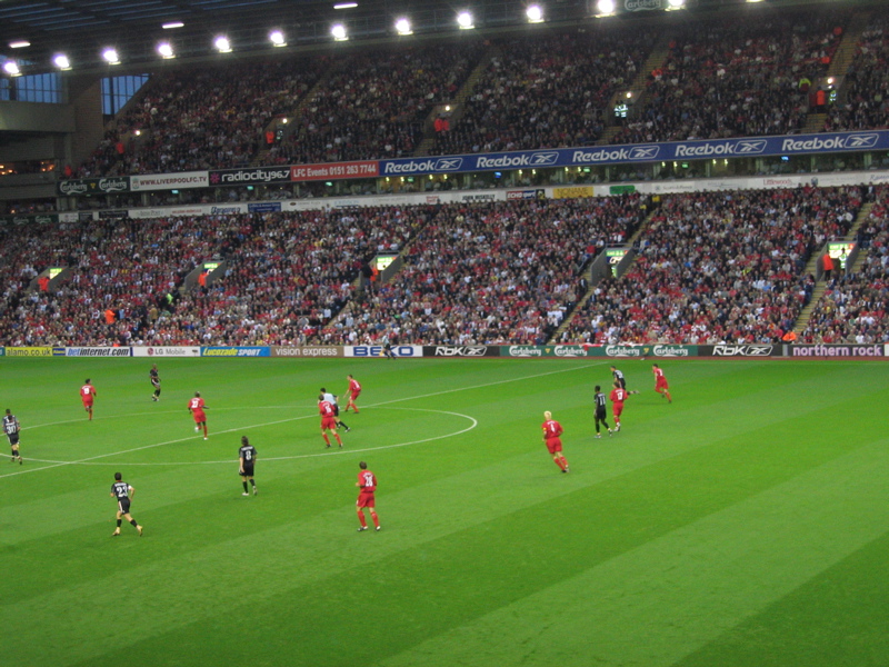 huumoria harrastavalle henkilölle. Aikataulut selvisivät ja pääsimme suhteellisen kivuttomasti bussilla Anfieldille,