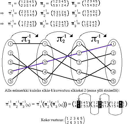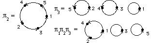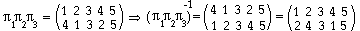 1 = (1 2 3 5 4), p2 = (1 5 4 2 3), p3 = (2 5) (3 4) , p1p2 = (4 5 2 3 1) p1p2p3 = (1 4 2).Alla kolme kiertoa myös graafisesti kuvattuna: