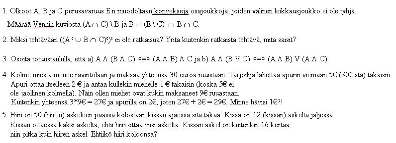5. Hiiri on 50 (hiiren) askeleen päässä kolostaan kissan ajaessa sitä takaa. Kissa on 12 (kissan) askelta jäljessä. Kissan ottaessa kaksi askelta, ehtii hiiri ottaa viisi askelta. Kissan askel on kuitenkin 16 kertaa niin pitkä kuin hiiren askel. Ehtiikö hiiri koloonsa?