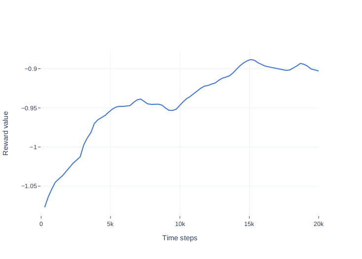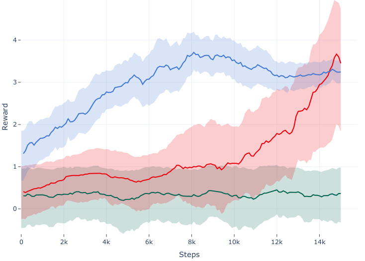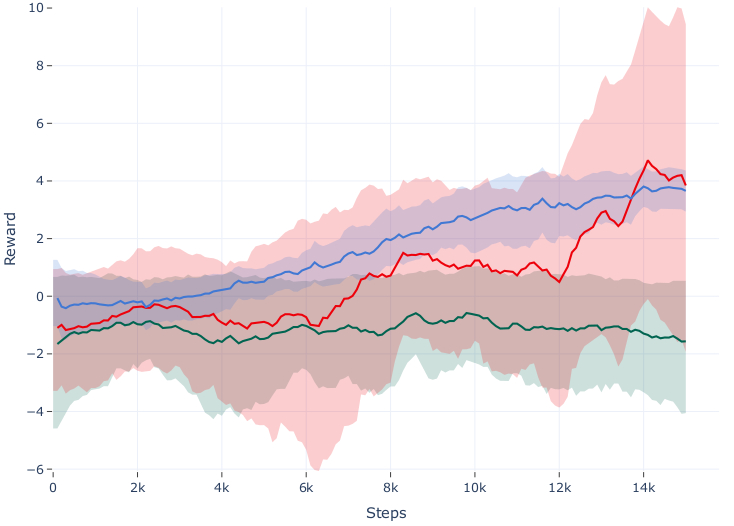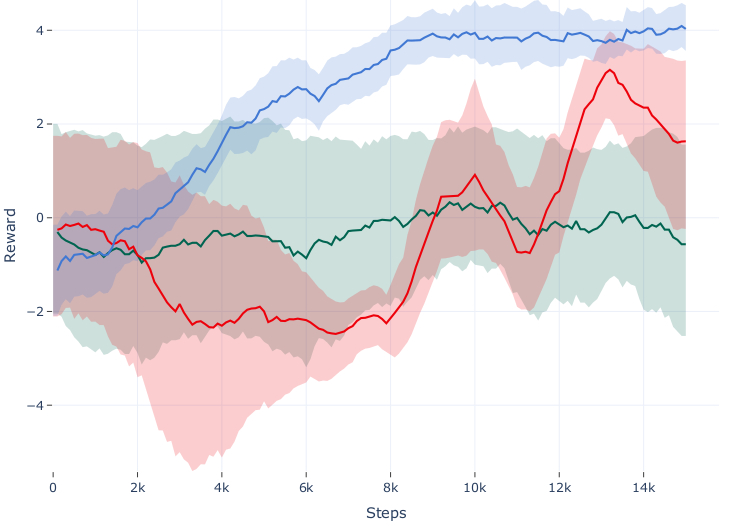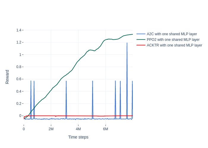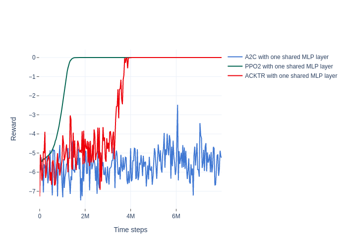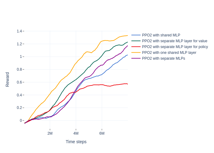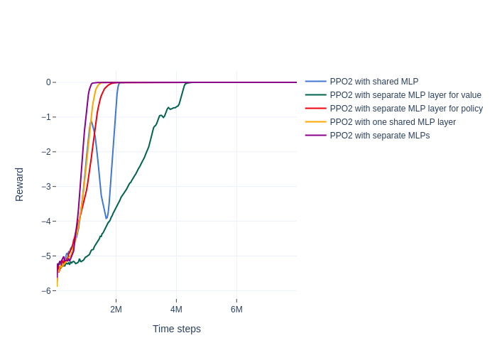 Speaking of reinforcement learning, we experimented with three state-of-art algorithms A2C, ACKTR and PPO evaluated in several virtualized environments. We concentrated on these algorithms as they can be applied for both discrete and continuous environments. In our experiments, PPO consistently provides good results in terms of both average reward and convergence speed (see the first two figures below). There is only one environment ACKTR outperforms PPO. We further will use PPO as our baseline algorithm while using ACKTR in case PPO struggles to find any good policy. Furthermore, we run several experiments with different network architectures (see the last two figures below). The results show that the network with one shared layer followed by two separate streams for policy and value function looks the most promising architecture variant. We also experimented with using shared LSTM layer for both policy and value function, but the results showed that much more steps is required for the algorithm convergence in this case, which can be critical in case of more complicated environment that requires more time per iteration. Code is avilable on Github, experiment reports can be found here and there.