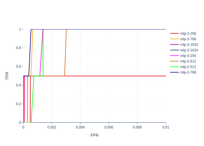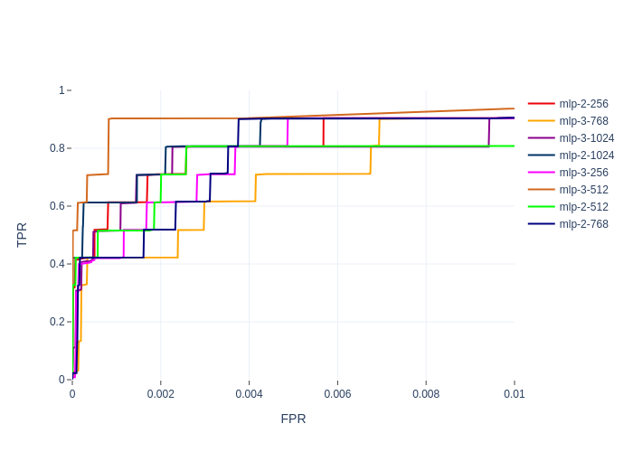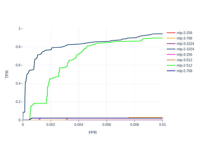 We concentrate on the intrusion detection based on the analysis of network traffic flows. For each such conversation, at each time window, or when a new packet arrives, we extract the following information: flow duration, total number of packets in forward and backward direction, total size of the packets in forward direction, minimum, mean, maximum, and standard deviation of packet size in forward and backward direction and overall in the flow, number of packets and bytes per second, minimum, mean, maximum and standard deviation of packet inter-arrival time in forward and backward direction and overall in the flow, total number of bytes in packet headers in forward and backward direction, number of packets per second in forward and backward direction, number of packets with different TCP flags, backward-to-forward number of bytes ratio, average number of packets and bytes transferred in bulk in the forward and backward direction, the average number of packets in a sub flow in the forward and backward direction, number of bytes sent in initial window in the forward and backward direction, minimum, mean, maximum and standard deviation of time the flow is active, minimum, mean, maximum and standard deviation of time the flow is idle. All the features can have different scale and therefore they are transformed into range between zero and one with the help of min-max standardization. Performance evaluation of malicious traffic detection supervised deep learning algorithms shows that they allow us to detect malicious connections without many false alarms. Results for the classification models vary in terms of true positive and false positive rates depending on the number of trainable parameters. ROC curves below are respectively for the following malicious traffic detection: FTP brute-force attack, SSH brute-force attack, Web brute-force attacks and botnet attack.