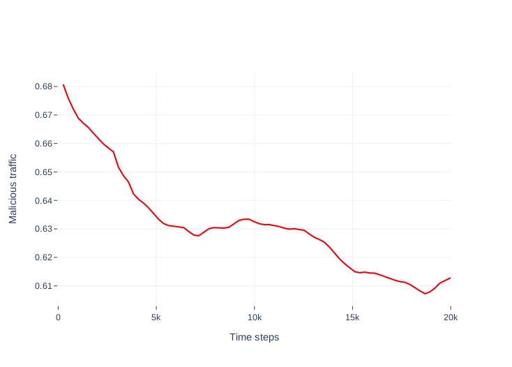 We also tried to apply reinforcement learning for spoofing a neural-network-based intrusion detection system by manipulating those flow parameters: probability of a packet to be sent in the current time window, size of the packet by padding the packet with zero bytes, time interval between two adjacent packets and size of the socket's receive buffer (in theory it should affects TCP window). The approach is to maintain a malicious TCP flow with the server as long as possible without it being detected. The idea is to add a packet to a malicious flow in such a way that it is classified by an IDS as normal. If at some point the flow is classified as a malicious, it is immediately blocked. In general, such approach works in the sense that the attacker becomes more and more efficient in keeping the connection alive, but the flow does not last forever. Figures below show some preliminary results for the HTTP password brute-force attack against the vulnerable application as used by the authors of CICIDS2017 dataset. As it can be seen from the figure, more than 80\% of the packets sent by the attacker become undetected after training the reinforcement learning agent, but sooner or later each malicious flow is classified as such anyway and it is blocked: average duration of a malicious flow is only 20 request-reply tuples which is enough for conducting the brute-force attack. As previously, code is available on Github and experiment reports can be found here and there.