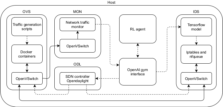 We run multiple copies of the environment in parallel. The training process is divided into episodes. Each episode lasts a certain fixed amount of time, during which one of the attacks is performed. The RL agent is implemented using OpenAI baselines. The agent selects one of the actions for each flow that are sent to the environment back-end where they are transformed to SDN rules. The reward for the action is proportional to the number of packets transferred during the most recent time window and it is calculated for each flow separately. The proportion coefficients are positive for legitimate traffic and negative for the malicious one. The exact values of the coefficients are estimated by running the attack without the agent and counting the average number of packets that are sent by the application and the attacker. The coefficients are then calculated as such a way, that the total reward without the agent's intervention is equal to zero.
