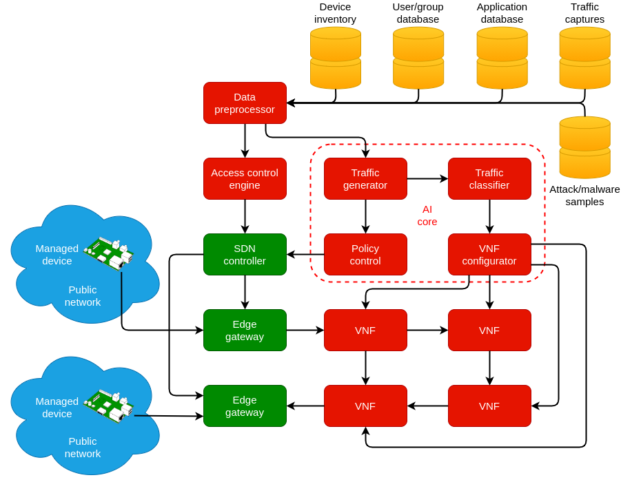 The second task of the AI core is related to security middle boxes reconfiguration. We are planning to implement such middle boxes using various deep learning algorithms. Such algorithms usually rely on one or several hyper-parameters that drastically affect the detection accuracy. Models trained with different parameters result in different sensibility and resiliency of the detection engine. Another challenge related to intrusion detection-based approach is static nature of the models used to describe normal user behavior. Such models cannot be used as a permanent attack detection solution since traffic in any network system is constantly subject to changes that may be for example related to varying loads of network services during different time of the day or anomalous events caused by a service failure or malicious activity. An intelligent reinforcement learning agent is therefore required to select both a detection algorithm and its parameters that are expected to be the most optimal in the current state of the network environment. Such agent observes features extracted from sessions of network traffic flows and sends new configuration parameters via a cloud orchestrator. The RL agent learns behavioral patterns of benign devices in the network and how those patterns may change in case of one or several of them are compromised. This will allow the agent to select the detection method that is the most optimal in terms of accuracy in the current state of the network environment.