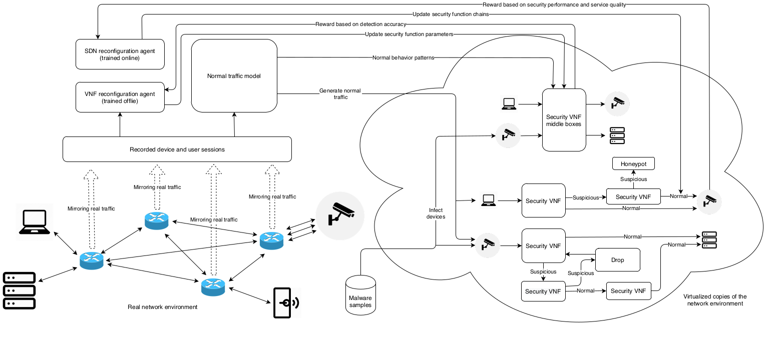 With the recent progress in the development of low-budget sensors and machine-to-machine communication, the Internet-of-Things has attracted considerable attention. Unfortunately, many of today’s smart devices are rushed to market with little consideration for basic security and privacy protection, making them easy targets for various attacks. Once a device has been compromised, it can become the starting point for accessing other elements of the network at the next stage of the attack, since traditional IT security castle-and-moat concept implies that nodes inside the private network trust each other. For these reasons, IoT will benefit from adapting a zero-trust networking model which requires strict identity verification for every person and device trying to access resources on a private network, regardless of whether they are located within or outside of the network perimeter. Implementing such model can however become challenging, as the access policies have to be updated dynamically in the context of constantly changing network environment. Thus, there is a need for an intelligent enhancement of the zero-trust network that would not only detect an intrusion on time, but also would make the most optimal real-time crisis-action decision on how the security policy should be modified in order to minimize the attack surface and the risk of subsequent attacks in the future. In this research project, we are aiming to implement a prototype of such defense framework relying on advanced technologies that have recently emerged in the area of software-defined networking and network function virtualization. The intelligent core of the system proposed is planned to employ several reinforcement machine learning agents which process current network state and mitigate both external attacker intrusions and stealthy advanced persistent threats acting from inside of the network environment.
