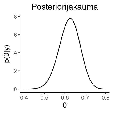 Posteriorista voidaan laskea esimerkiksi approksimatiivinen 90 %:n Bayes-väli parametrille \(\theta\): \(0.627 \pm 1.644 \times 0.0516\) ja saadaan tulokseksi \((0.590, 0.711)\). Tulos vastaa varsin hyvin numeerisella integroinnilla saatua (jota voidaan pitää tarkkana). Tässä tapauksessa Laplace-approksimaatio toimii.