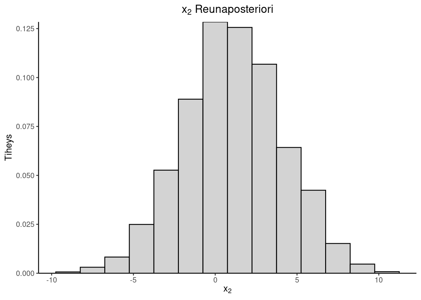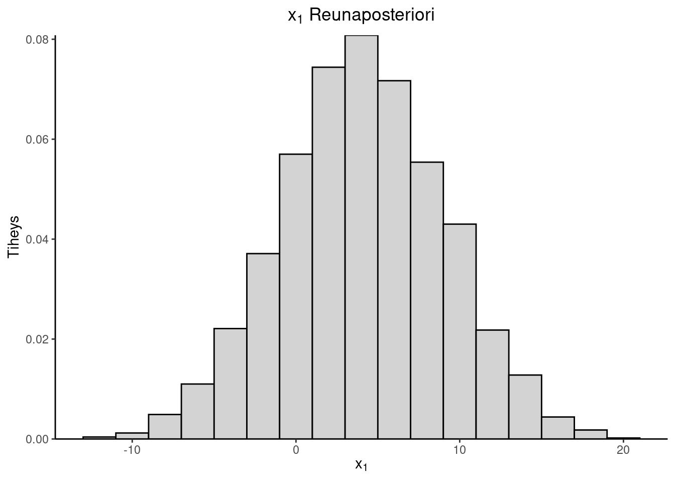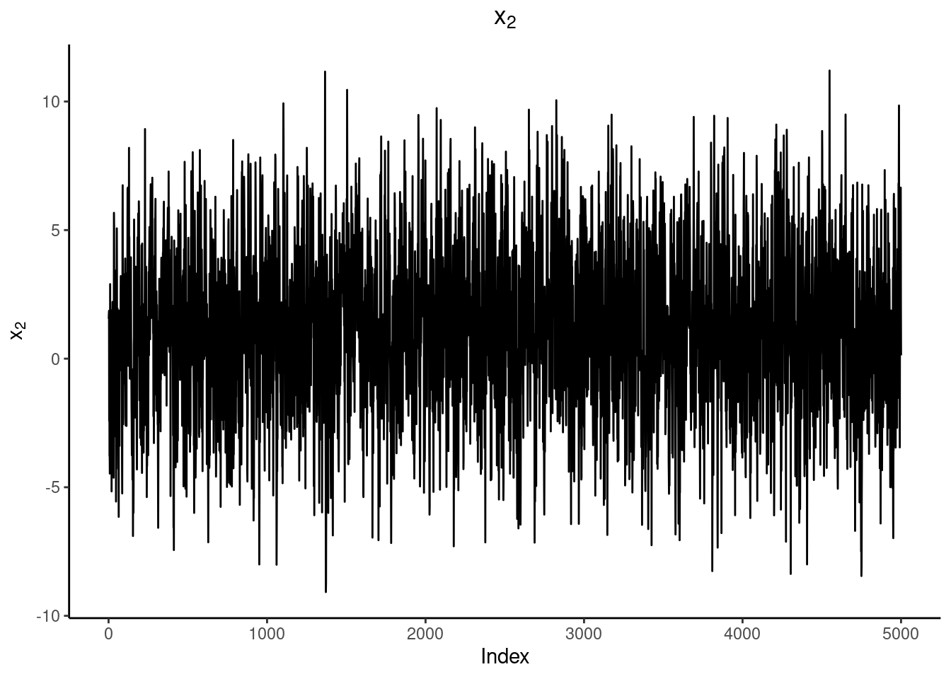 Simulointi etenee seuraavasti: Olkoon alkuarvo \((x_1^{(0)},x_2^{(0)})^T\). \[ \begin{pmatrix} x_1^{(0)} \\ x_2^{(0)} \end{pmatrix} \rightarrow \begin{pmatrix} x_1^{(1)} \\ x_2^{(0)} \end{pmatrix} \rightarrow \begin{pmatrix} x_1^{(1)} \\ x_2^{(1)} \end{pmatrix} \rightarrow \begin{pmatrix} x_1^{(2)} \\ x_2^{(1)} \end{pmatrix} \rightarrow \cdots \] Simuloinnin voi toteuttaa esimerkiksi R-ohjelmistolla seuraavasti