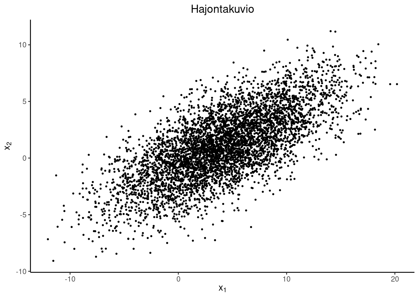 Esimerkki 3.1 (Kaksiulotteisen normaalijakauman simulointi) Oletetaan, että \[ \begin{pmatrix} X_1 \\ X_2 \end{pmatrix} \sim \operatorname{N}_2(\mu, \Sigma),\, \mu = \begin{pmatrix} \mu_1 \\ \mu_2 \end{pmatrix},\, \Sigma = \begin{pmatrix} \sigma_1^2 & \sigma_{12} \\ \sigma_{12} & \sigma_2^2 \end{pmatrix}. \] On laskettava ehdolliset jakaumat. Tässä tapauksessa saadaan: \[ \begin{aligned} X_1|X_2 &= x_2 \sim \operatorname{N}\left(\mu_1 + \frac{\sigma_1}{\sigma_2}\rho(x_2-\mu_2),(1-\rho^2)\sigma_1^2 \right) \\ X_2|X_1 &= x_1 \sim \operatorname{N}\left(\mu_2 + \frac{\sigma_2}{\sigma_1}\rho(x_1-\mu_1),(1-\rho^2)\sigma_2^2 \right), \end{aligned} \] missä \(\rho = \dfrac{\sigma_{12}}{\sigma_1 \sigma_2}\) on korrelaatiokerroin.