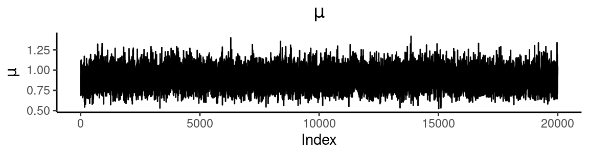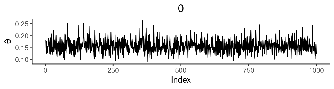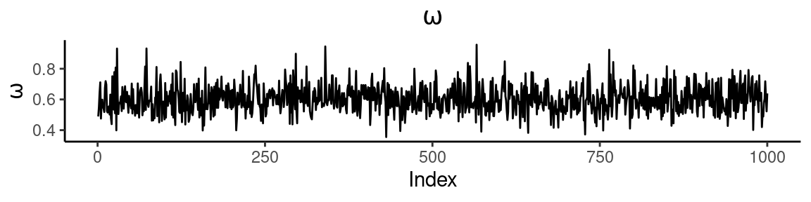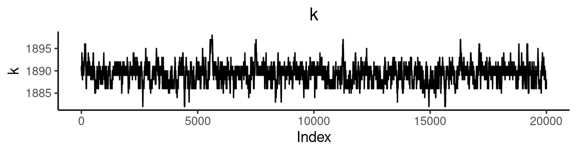on posteriori parametrille \(\theta\) ehdolla data, jossa puuttuva arvo \(y_i\) on korvattu edellisen päivityksen antamalla arvolla. Ensimmäinen askel on helppo tehdä lasketusta jakaumasta, toisen voi tehdä Metropolisin algoritmilla. NIMBLEssä riittää korvata puuttuva havainto NA
