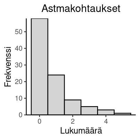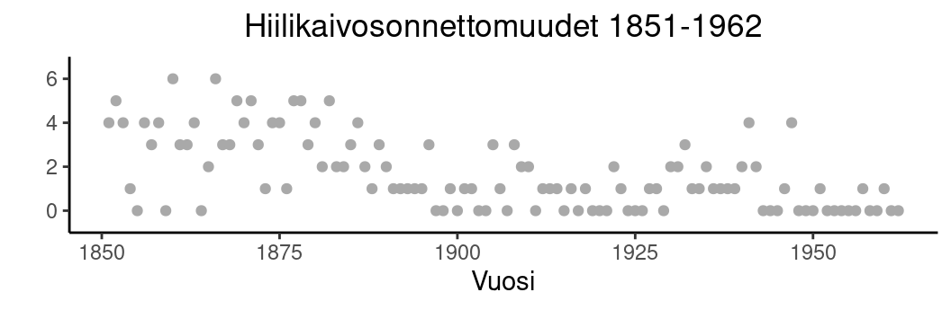 Esimerkki 5.3 (Hiilikaivosonnettomuudet) Seuraava aineisto kuvaa hiilikaivosonnettomuuksien määrää vuosina 1851–1962 (\(n = 112\), coal.dat