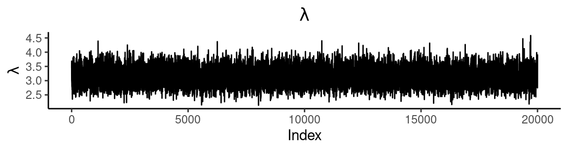 Lasketaan ehdollinen jakauma \(p(\lambda|\mu,k,y)\) \[ p(\lambda|\mu,k,y) \propto \lambda^{A + \sum_{i=1}^k y_i - 1}e^{-(B+k)\lambda}, \] joka on \(\operatorname{Gamma}(A + \sum_{i=1}^k y_i, B + k)\).