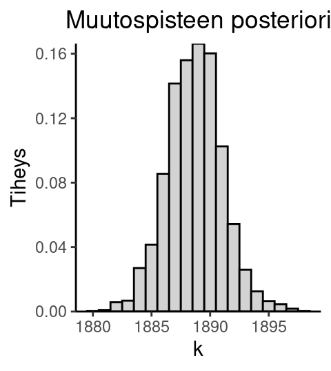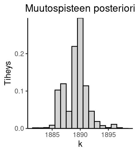 Uskottavuus. Olkoon \(\lambda\) intensiteetti muutospisteeseen \(k\) saakka ja \(\mu\) siitä alkaen. Oletetaan, että on olemassa täsmälleen yksi muutospiste. Silloin \(k \in \{1,\ldots,n-1\}\), missä \(n\) on havaintojen lukumäärä. Oletetaan edelleen, että \[ \begin{aligned} y_i|\lambda,\mu,k &\sim \operatorname{Poisson}(\lambda),\quad i = 1,\ldots,k,\quad \textrm{vaihdannaisia, ja} \\ y_i|\lambda,\mu,k &\sim \operatorname{Poisson}(\mu),\quad i = k+1,\ldots,n,\quad \textrm{vaihdannaisia}. \end{aligned} \] Lisäksi \(y_i\) ja \(y_j\), \(i \leq k, j > k\) ovat ehdollisesti riippumattomia ehdolla \(\lambda,\mu,k\).