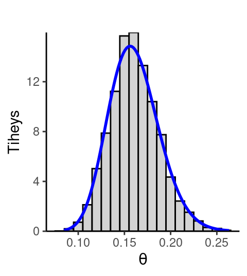 Parametrin \(\theta\) posteriorijakauman odotusarvo on 0.161 ja keskihajonta 0.026, ja 95 %:n Bayes-väliksi saadaan (0.113, 0.217).