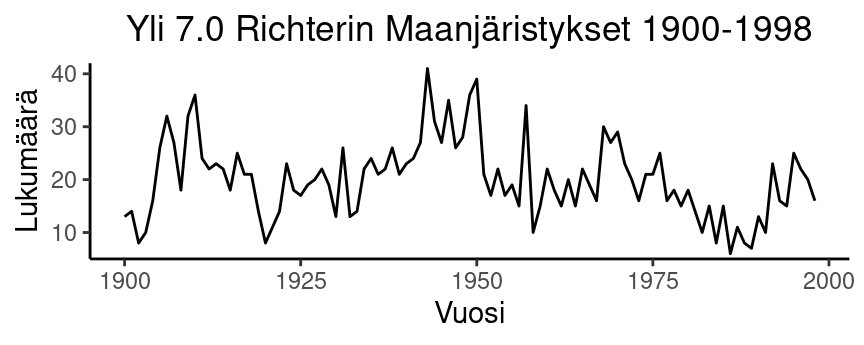 Esimerkki 5.10 (Maanjäristykset) Seuraava aineisto esittää vuosihavaintona 7.0 Richterin ylittävien maanjäristysten lukumäärää vuosilta 1900-1998 (99 havaintoa, earthq.dat