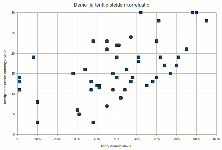 Alla olevasta kuvasta näkee kuinka tehdyt demotehtävät ja tentistä saatu pistemäärä vastaavat toisiaan.