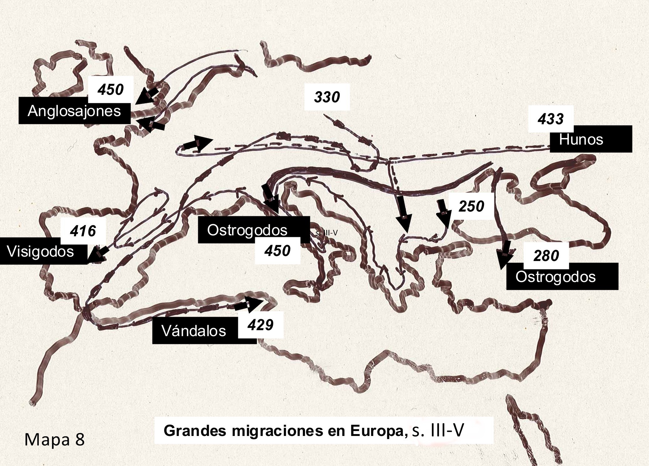 Durante el siglo III, el poder militar, político y econónico de Roma se debilita. Esta debilidad permitió la aparición y establecimiento en los territorios septentrionales y laterales del Imperio de pueblos de diversos orígenes.Por lo que a España se refiere, se considera que los pueblos germánicos llegaron a la península entre el 409 y el 416. (Véase Mapa 8)